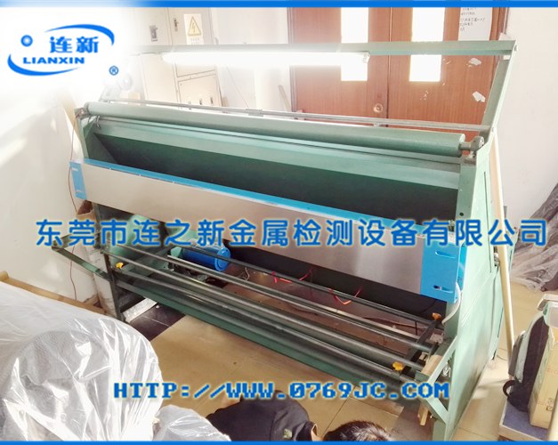 厚街某鞋业鞋材集团简易验布机加装平台式验针机使用现场,该鞋材厂因鞋材面料(布料)中很容易极易混入生产设备上掉落的铁锈、铁锈、断针等异物,客户投诉多,严重影响了后续订单的进行。因此,不惜代价也要把这些金属异物在源头上拦截下来,坚决杜绝次品现象。通过考察,选定我连之新为其量身定制了一款宽幅平台式检针器。我公司对此轻车熟路,全机采用CAD精确制图,激光切割及焊接工艺并用,安装孔位和速度、及灵敏度的要求完全按客户愿望,完美收工。